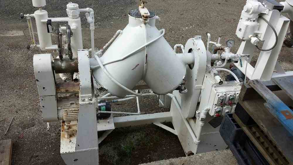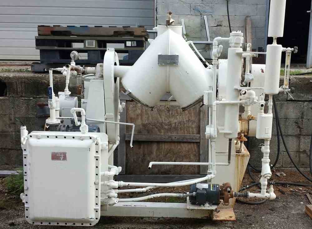 Used 2 Cu.Ft. Patterson-Kelley Twin Shell Solids Processor, S/S Patterson-Kelley Twin Shell Solids Processor, 2 cu.ft. working capacity, Stainless Steel Construction, Rated Full Vacuum Internal, Jacketed For 30 PSI @ 250 Degrees F, Rated 300#/cu.ft. max density. Liquid/Solids Intensifier Bar With Motor, 2 HP Reeves Variable Speed, 3/60/230-460 volt, Explosion proof main Drive, 2 HP, 3/60/230-460 volt 1725 RPM Explosion proof bar drive, Standard Feed Ports With Covers, Complete on Stands, with Heater, Vacuum Pump, circulating pump, and Solvent Recovery Package, National Board Code Stamped
