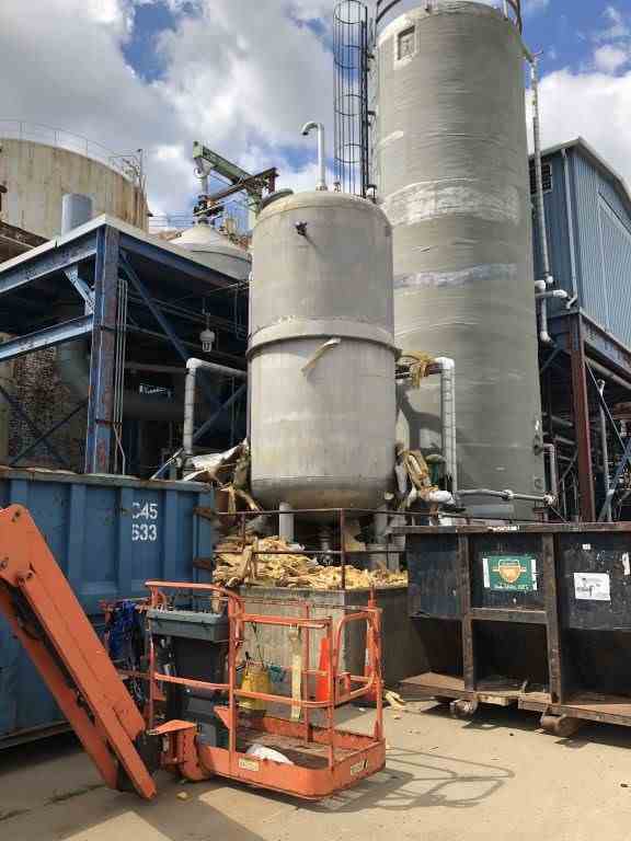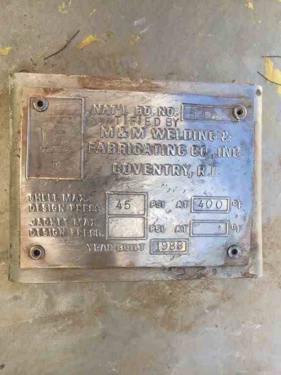 Used Approx 5,500 gallon M&M Welding & Fabricating Co, Inc 316 Stainless Steel Vertical Pressure Vessel. Rated 45 psi @ 400F. Cone Bottom. (4) leg mounted. Dimensions – 8 ‘ x 14’. Serial # 87-340, National Board #546, Built 1988.