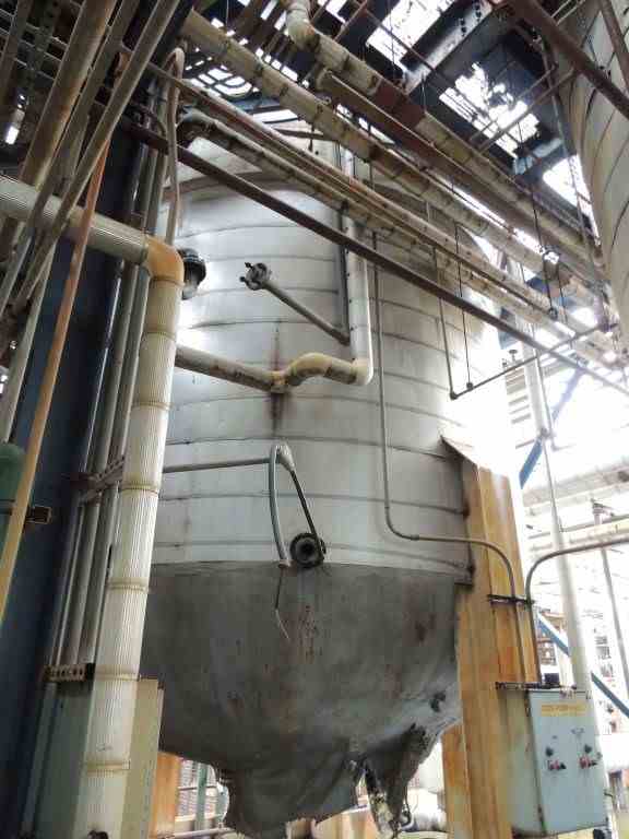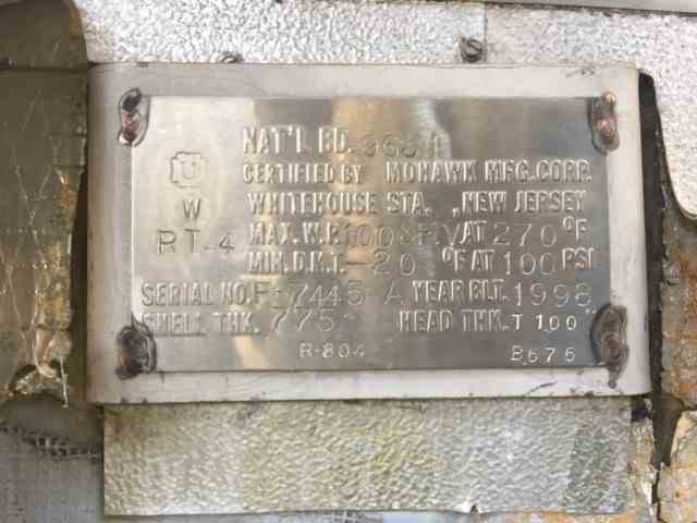 Used 20000 gallon Mohawk Mfg Corp 316L Stainless Steel Vertical Mixing Pressure Vessel. Philadelphia drive - 15 HP. Dome Top and bottom. (4) Leg mounted. Rated 100 PSI/FV @ 270 F. Serial # F-7445-A, National Board #9631, Built 1998.