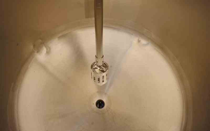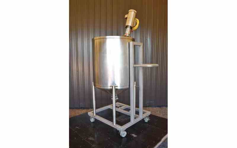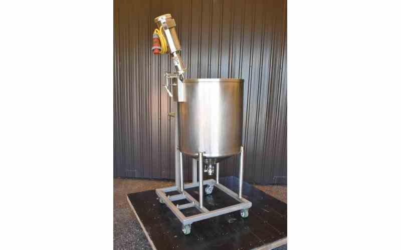 USED 100 GALLON STAINLESS STEEL TANK WITH CLAMP ON ROTOSOLVER. DIMENSIONS: 30" DIAMETER X 32" STRAIGHT SIDE, 8" CONE BOTTOM. OPEN TOP. DISCHARGE: 2" WITH BUTTERFLY VALVE. WITH CLAMP ON ROTOSOLVER, MODEL: 80RS70SS. STAINLESS STEEL SHAFT LENGTH: 35"