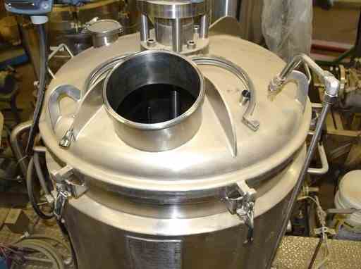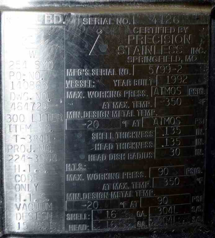Precision Stainless Kettle, 300 Liter (79 Gallon), Stainless Steel, Vertical. Internal rated atmospheric at -20 to 350 degrees F. 304L Stainless steel dimple jacket rated 90 psi at -20 to 350 degrees F., vacuum design 15 psi. Dish top/bottom. 1/5" Center bottom outlet. Serial #5799-2. National Board #4126. Built 1992.