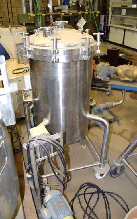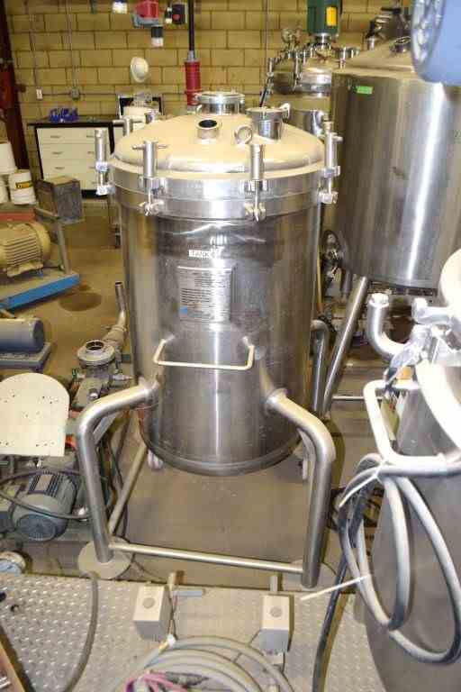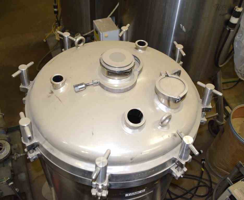 Used 52 Gallon Cherry-Burrell Pressure Tan. 200 Liter. 316L Stainless Steel, Vertical. Approximate 24" diameter x 31" straight side, dished clamp top, dished bottom. Internal rated 45 psi at -20 to 350 degrees F. Approximate 1" center bottom outlet. Mounted on 4 stainless steel legs with casters. Serial #F-289-96. National Board #4562. built 1996.