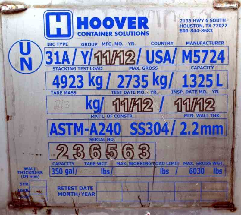 Hoover Container Solutions Liquid Tote, 1325 Liter (350 Gallon), IBC Type 31A, 304 Stainless Steel. Approximate 41" x 48" x 36" tall. Maximum gross weight 2735 kg. Serial #236563, built 2012.