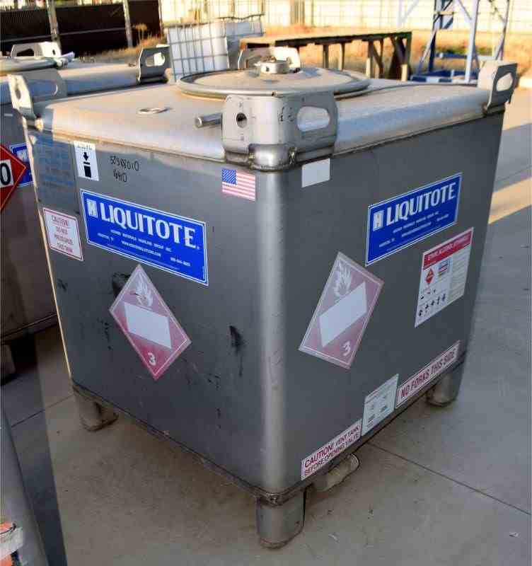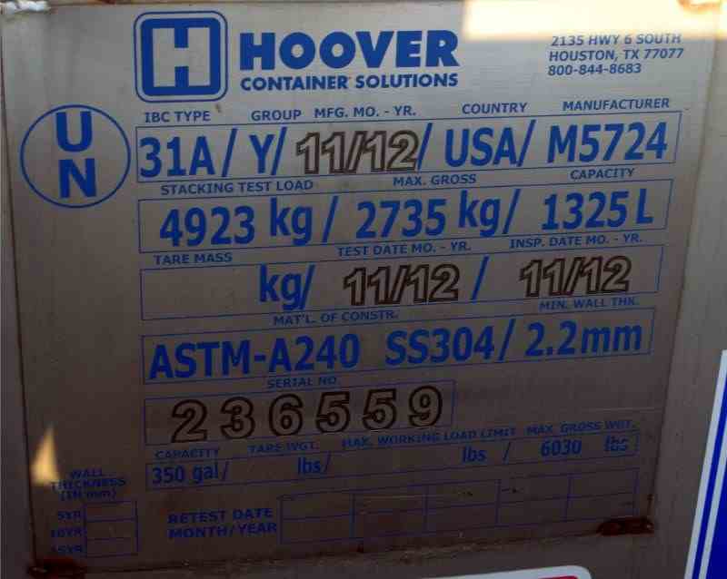 Hoover Container Solutions Liquid Tote, 1325 Liter (350 Gallon), IBC Type 31A, 304 Stainless Steel. Approximate 41" x 48" x 36" tall. Maximum gross weight 2735 kg. Serial #236559, built 2012.