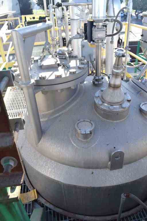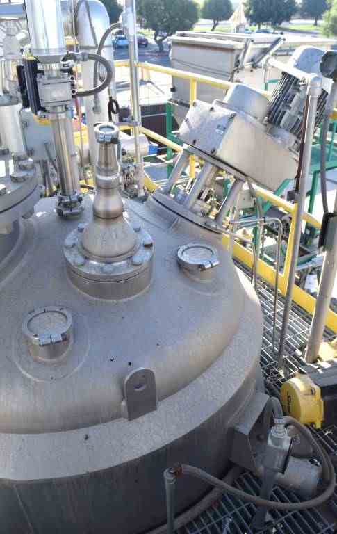 A&B Process Systems Reactor, Approximate 400 Gallon, 304L Stainless Steel, Vertical. 54” Diameter x 24” straight side, Dished top, jacketed hemispherical bottom. Internal rated 150 psi at -20 to 425 degrees F., 304L stainless steel jacket rated 150 psi at -20 to 425 degrees F. Off center top entering angled anchor agitator with scrapers, driven by a 10hp, 3/60/230/460 volt, 1770 rpm gear motor, ratio 40.80 to 1. Top 18" man way with davit arm cover, 4” center bottom outlet. Mounted on (3) side lugs. Serial# 1118160301C, National Board#1607, built 2012.