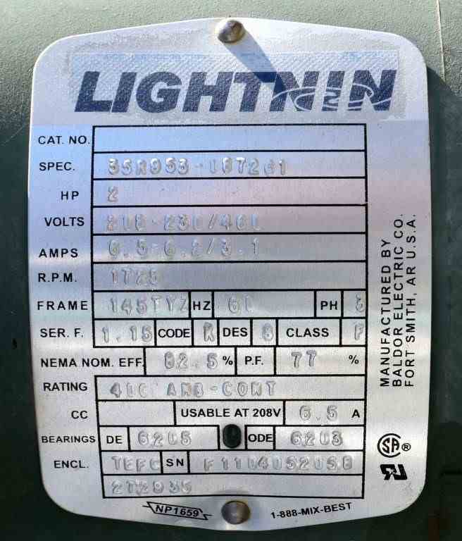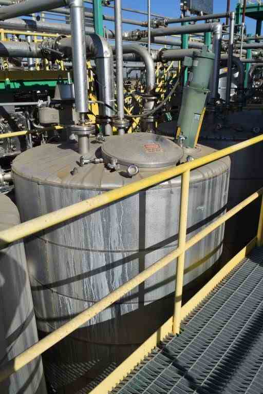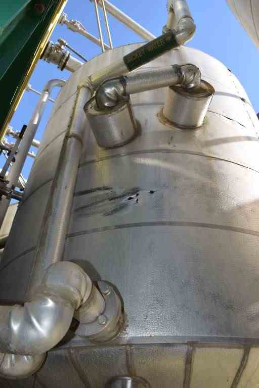 Used 1500 Gallon Andy J. Egan Jacketed SS Tank. 316L Stainless Steel, Vertical. Approximate 72” diameter x 84” straight side, slight coned top, cone bottom. Jacketed, no rating. Off center top entering angled Lightnin agitator, model X6S200, serial# 2636791. Approximate 1-1/2” diameter shaft with (1) 3 blade turbine, (1) 3 blade prop, driven by a 2hp, 3/60/208-230/460 volt, 1725 rpm motor. (2) Spray balls. Openings top 2”, (2) 3”, (2) 4”, 6” drive, sight glass, 24" man way with cover, side (3) 3”, 4” center bottom outlet. Mounted on (4) 304 stainless steel legs. Built 2011.