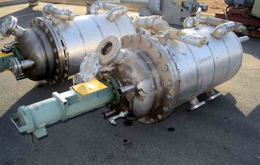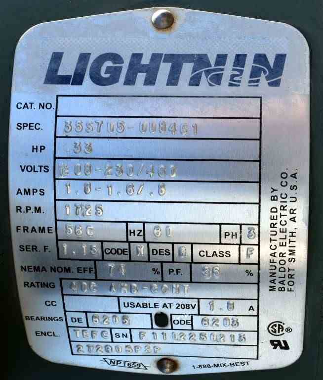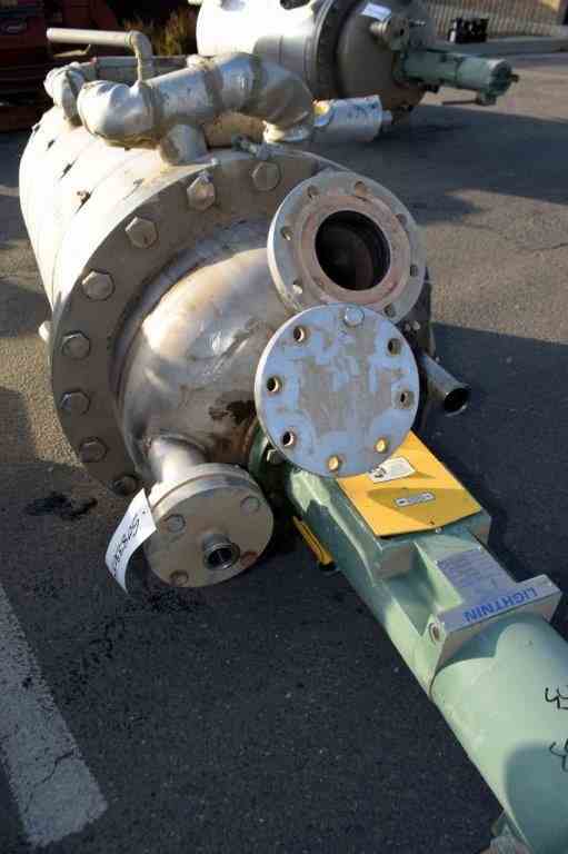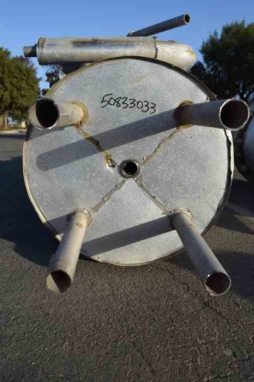 Used 100 Gallon Andy J. Egan 304 Stainless Steel Tank., Vertical. Approximate 24” diameter x 48” straight side, dished bolt top, dished bottom. Top entering Lightnin agitator, model X5S33, serial# 2636794, driven by a 0.33hp, 3/60/208-230/460 volt, 1725 rpm motor. (3) Sidewall baffles, strap on panel jacket. Openings top (3) 1”, 2”, 3”, 4”, 6”, side (4) 3”, 2” center bottom outlet. Mounted on (4) stainless steel legs. Built 2011.