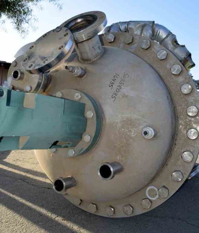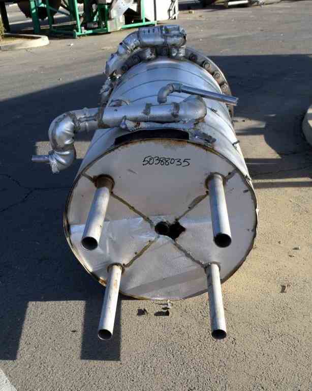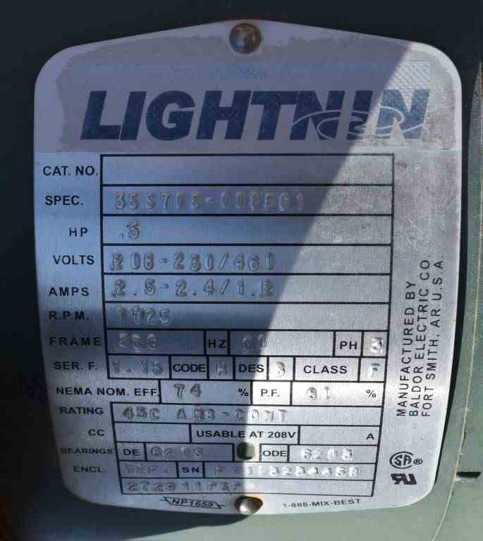 Used 200 Gallon Andy J. Egan 304 Stainless Steel Tank. Vertical. Approximate 30" diameter x 60" straight side, dished bolt top, dished bottom. Top entering Lightnin agitator, Model X5S50, Serial # 2636801, driven by a 0.50 hp, 3/60/208-230/460 volt, 1725 rpm motor. Strap on panel jacket. Center bottom outlet. Mounted on (4) stainless steel legs.