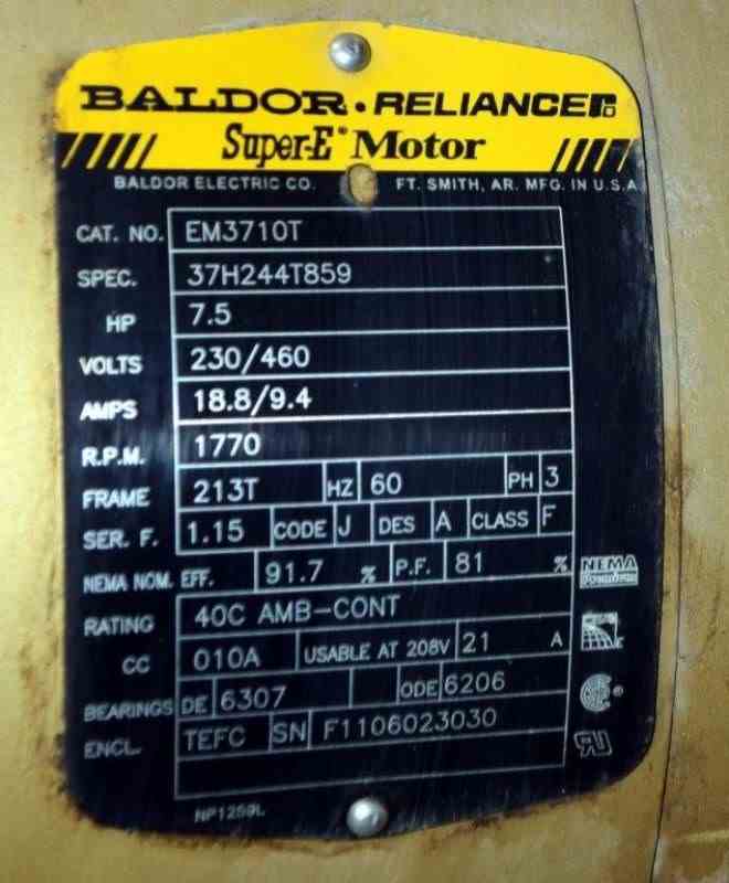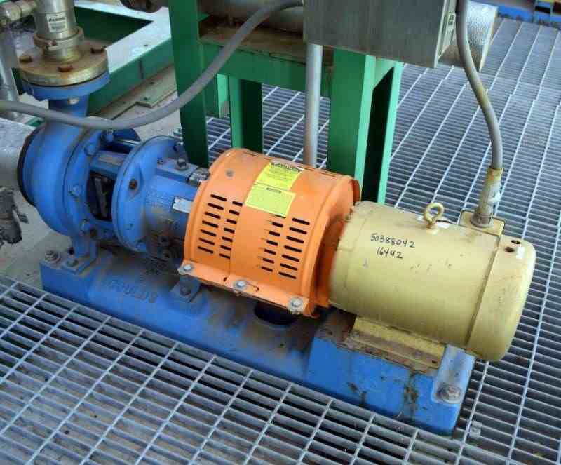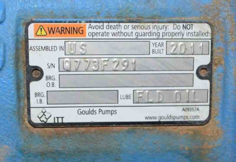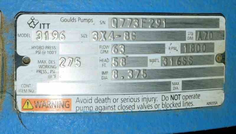 Goulds Centrifugal Pump, Model 3196, Size 3X4-8G, 316 Stainless Steel. Rated approximately 63 gallons per minute at 58' head at 1800 rpm, 275 psi. 4” Inlet, 3” outlet, 8.375” diameter impeller, mechanical seal. Driven by a 7.5hp, 3/60/230/460 volt, 1770 rpm motor. Base mounted. Serial# Q773F291, built 2011.