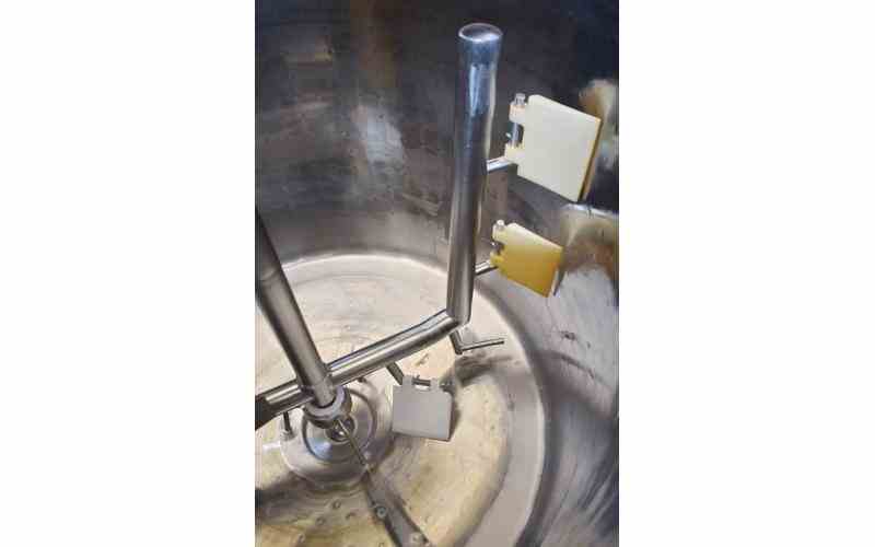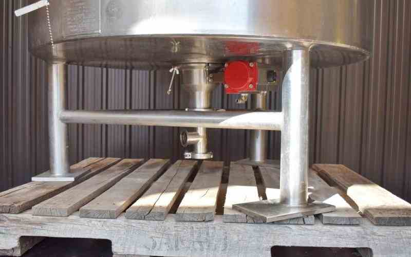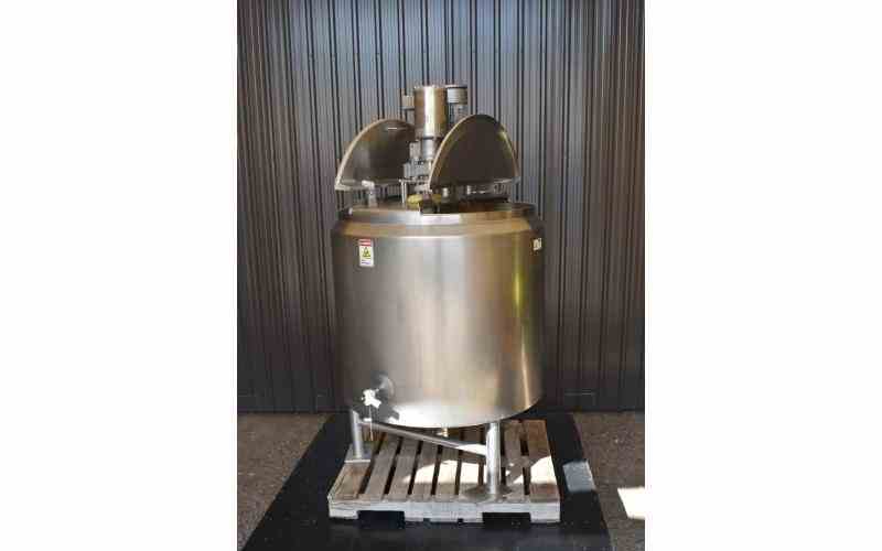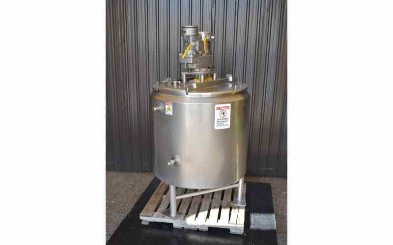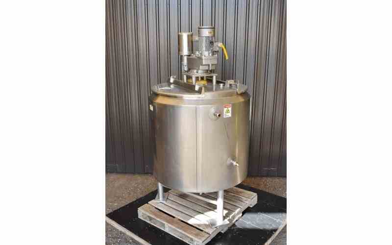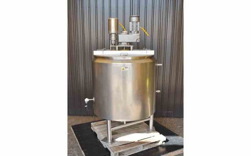 USED 200 GALLON JACKETED STAINLESS STEEL TANK WITH SCRAPE AGITATION & MIXER. DIMENSIONS: 42" DIAMETER X 40" DEEP, WITH TWO PART HINGED LID. TOP INLET: TWO 2" TRI CLAMP. DISCHARGE: 3" WITH BALL VALVE & VALVE ACTUATOR. TWO ZONE DIMPLE JACKET. JACKET PRESSURE: 100 PSI @ 350 DEG.F. TWO ZONE DIMPLE JACKET, RATED 100 PSI @ 350 DEG.F. WITH SCRAPE AGITATION,
