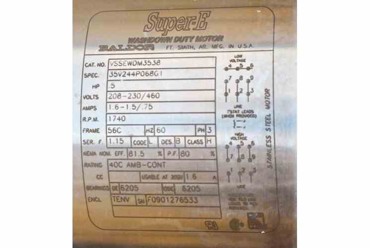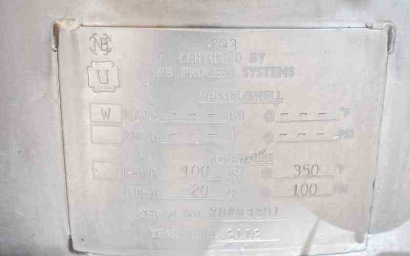 MOTOR: 1.5 HP, 230/460 VOLT, 1660 RPM, GEAR REDUCER RATIO: 64.12/1, OUTPUT RPM: APPROX. 26. WITH TOP ENTRY MIXER WITH WASHDOWN DUTY STAINLESS STEEL MOTOR: 0.5 HP, 230/460 VOLT, 1740 RPM, REDUCER RATIO: 7.26/1, OUTPUT RPM: 240 APPROX. BUILT BY A&B PROCESS SYSTEMS 2002, NATIONAL BOARD NO. 203. OVERALL HEIGHT: 86". PREVIOUS USE: FOOD APPLICATION