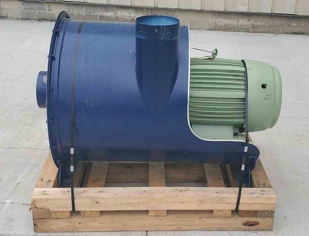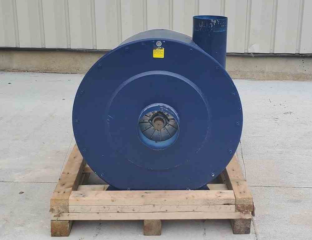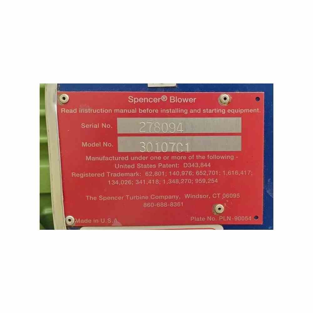 Used 50 HP Spencer Industrial Vacuum Blower Model 30107C1. Standard overhung design. Clockwise rotation (3535RPM). Rated for 1,080 SCFM @ 7 In. Hg (70°F Inlet temp.). 8" dia sleeve connections (inlet/outlet)