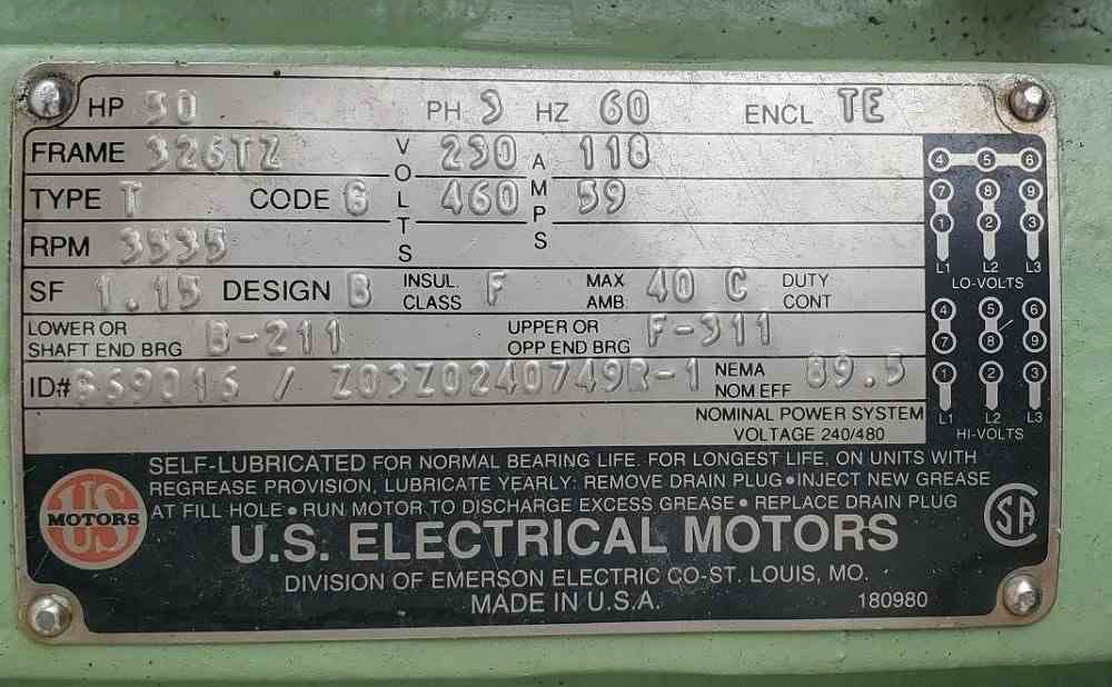 460VAC, 60Hz, 3 phase. Also included: disconnect enclosure, check valve, automated vacuum relief valve with set-point controller model CTB-90005