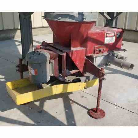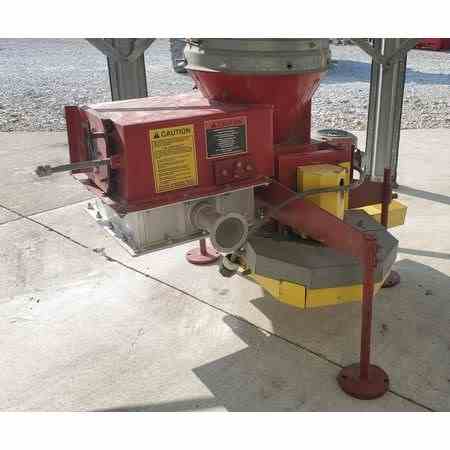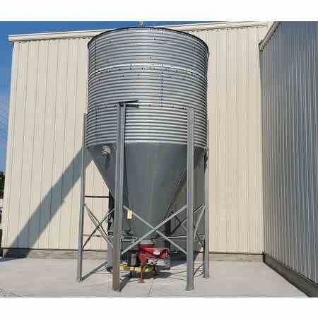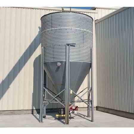 Used Bolted Galvanized Silo 600 cu/ft Dry Storage Hopper Bin w/ Discharger. (Capacity equivalent to 482 bushels). Bin wall is 9' diameter with a 7'-6" straight side wall, fabricated with galvanized & corrugated steel sheet (18GA). All bin panels are of a sealed overlap, bolt-together design. Sloped roof with air vent and centered 20" dia. product inlet sleeve. High and low level rotary paddle level indicators. 60 deg. bottom cone hopper. Supported on six- braced legs with base plates for anchoring. Product discharge is 16"Ø sleeve into a Flying Dutchman bin discharger (requires 230/460 volts, 3 ph. 60Hz). Floor to product inlet is 18'-4".
