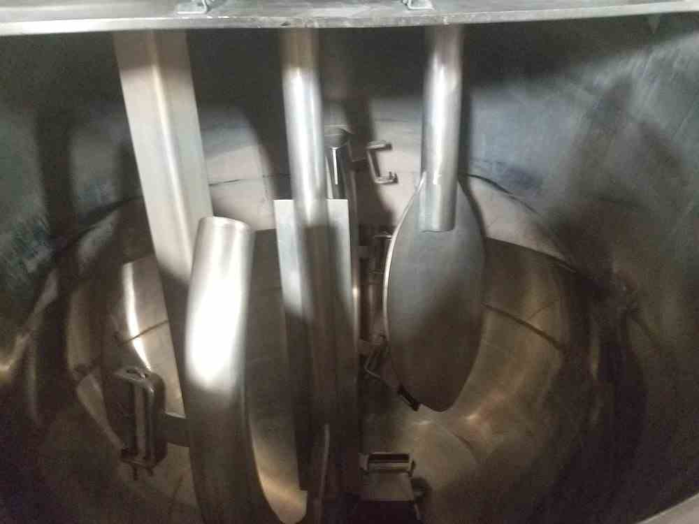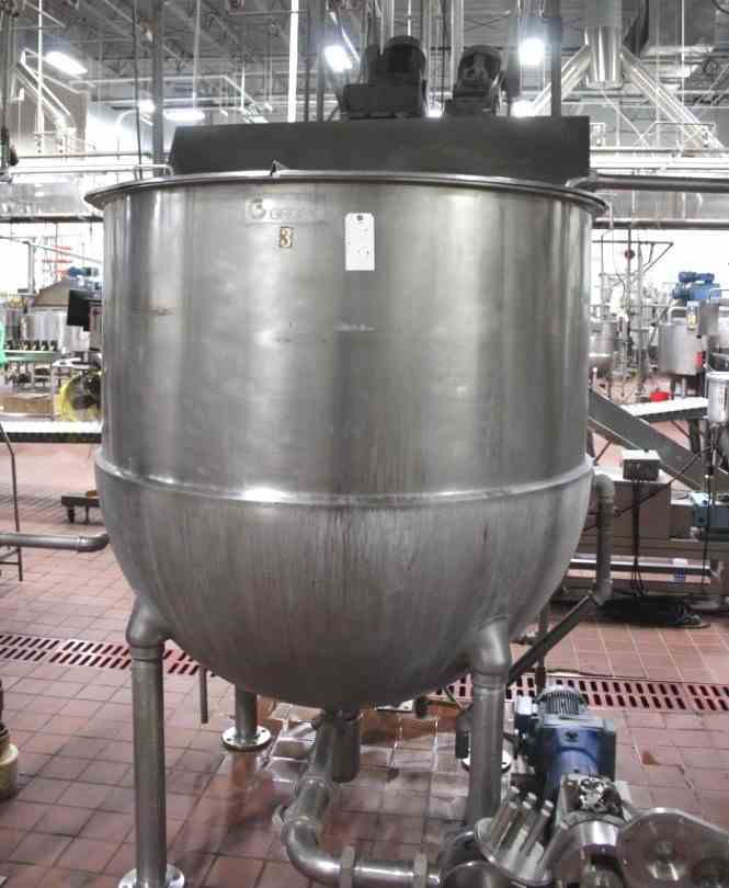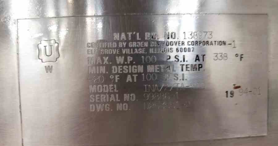 Used 500 Gallon Groen Jacketed Mix Kettle with Double Motion Scrape Surface agitation. Inclined Scrape Surface Agitator with Secondary Paddle Agitator. Motors: 5 HP, 230/460V. Jacket rated 100 PSI @ 338 Deg.F. Model INA/2/TA-500. S/N 99886-1. Last used in sanitary food plant.