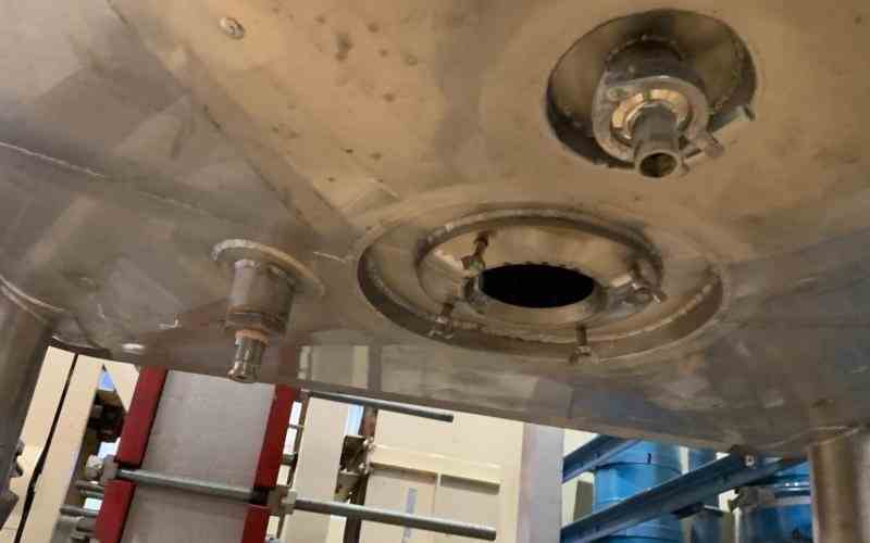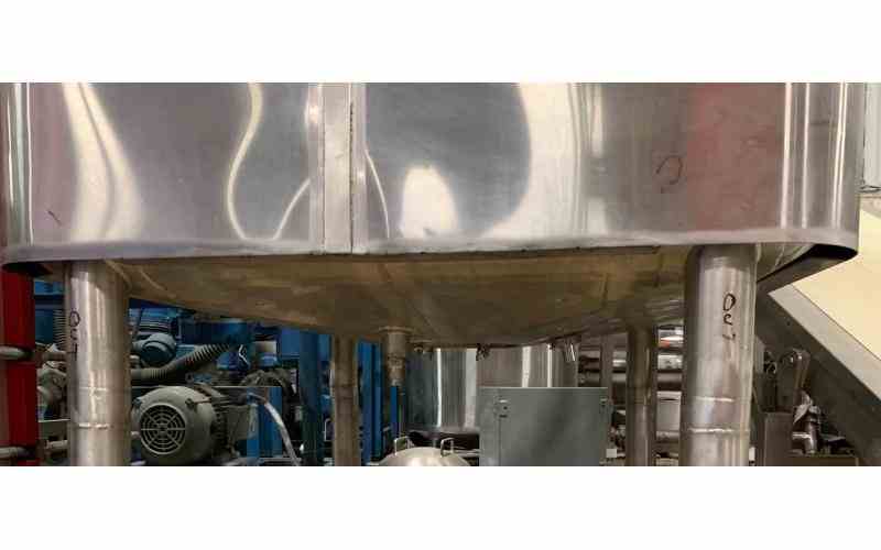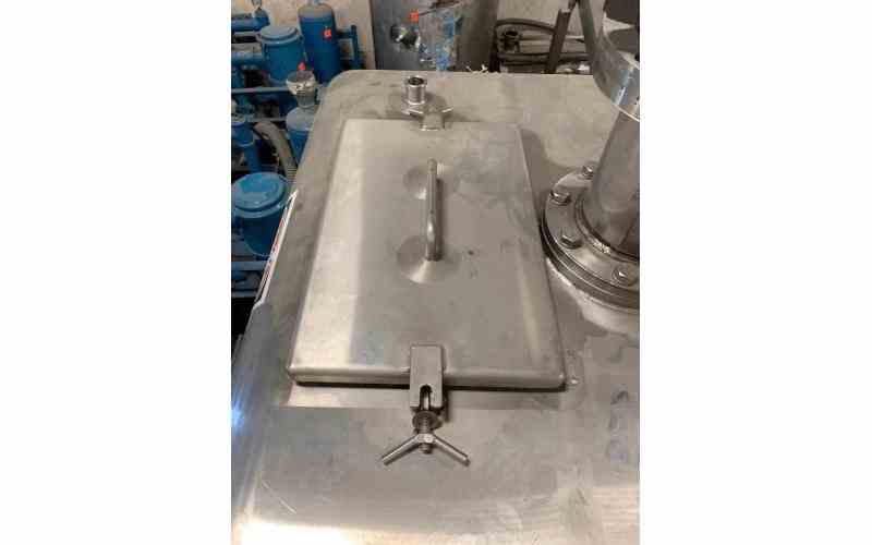USED 100 GALLON JACKETED TANK, STAINLESS STEEL, SANITARY WITH MIXER. INTERIOR DIMENSIONS: 48" X 48" X 50" DEEP. CENTER DISCHARGE: 4". TOP INLETS: TWO 2", ONE 1.5" TRI CLAMP. TOP SIDE PORT: 1.5" TRI CLAMP. TOP MANYWAY WITH LID: 12" X 20". WITH TOP ENTRY MIXER