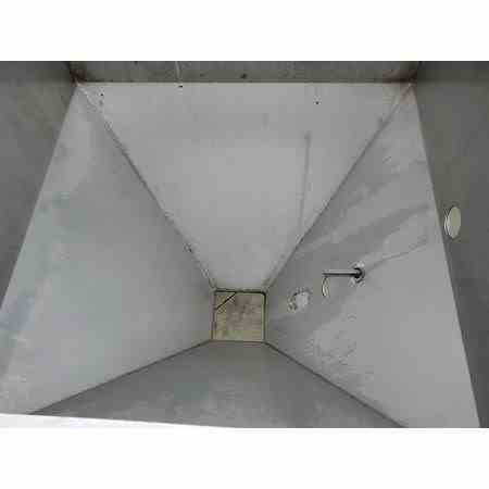 Used 100 Cubic Ft Stainless Steel Hopper Bin. 60" Square top opening with flared inlet panels. Continuous fillet welded construction. 11GA stainless steel sheet. 60° hopper with 12" sq. outlet flange (20" discharge height). Braced 3" structural angle legs with floor mounting lugs. High and low level sight glass and Bindicator point level switch