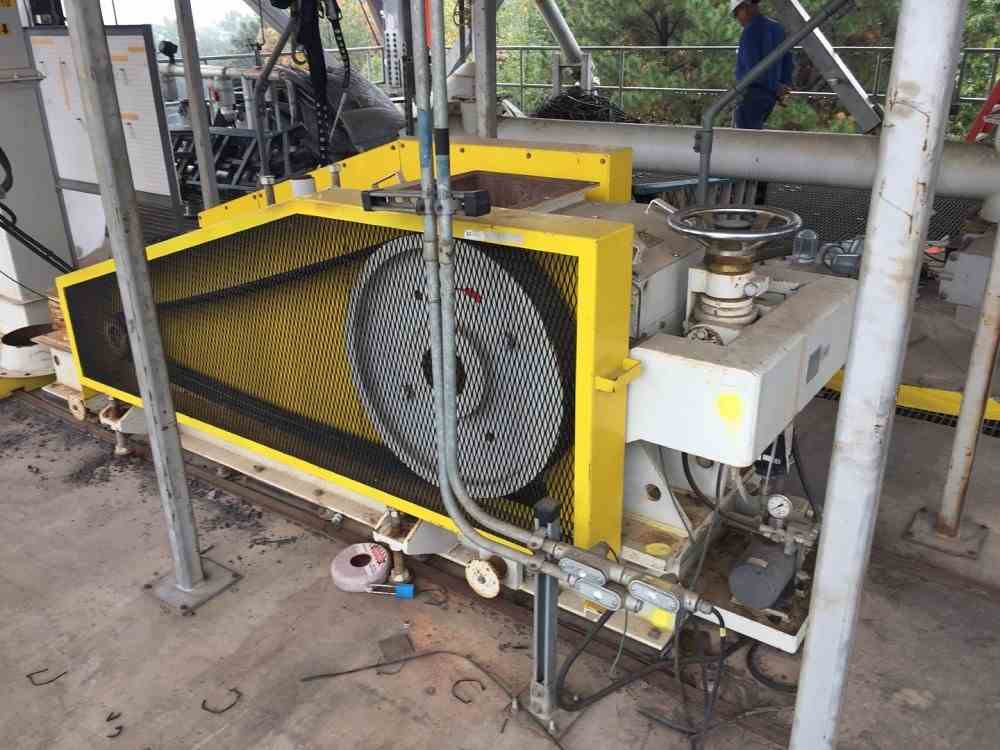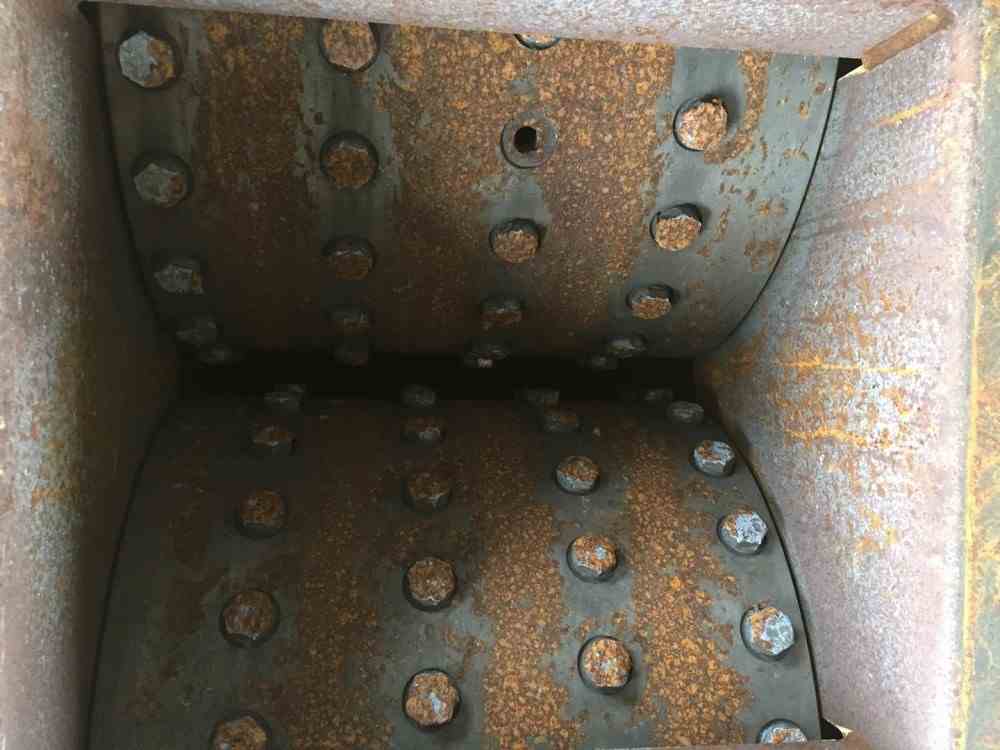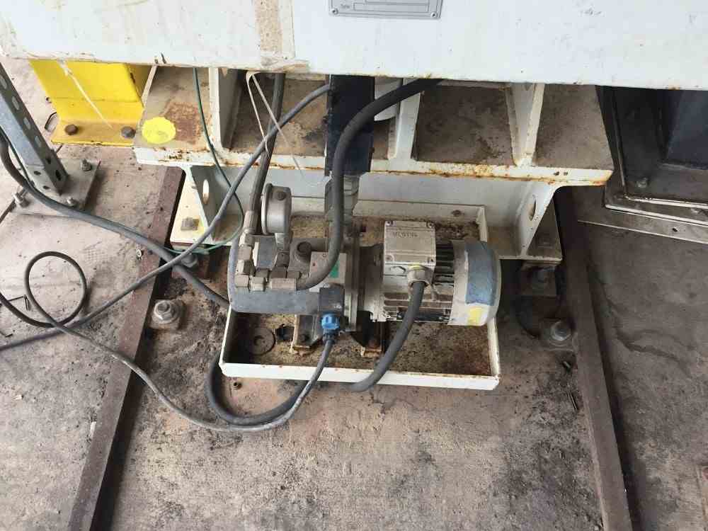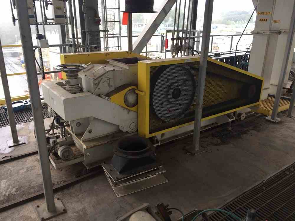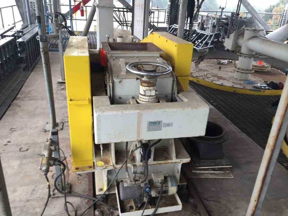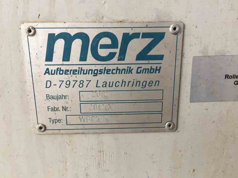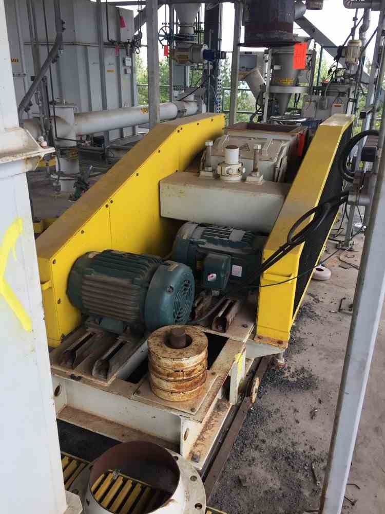 Used 10HP Merz two roll crusher. Model WBP5/4. 19.6" x 15.7" wide rolls, independently driven front and back rolls, with 10 hp and 7.5 hp motors, manual gap adjustment with hydraulic gap clamping unit, mounted on common base. Serial# 2012137. Built 2012.