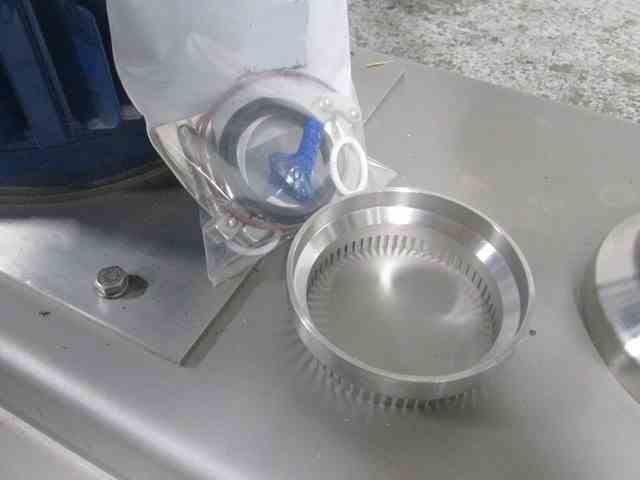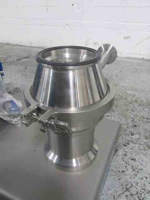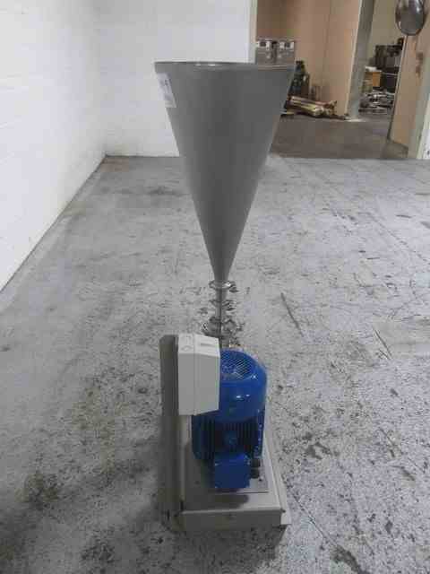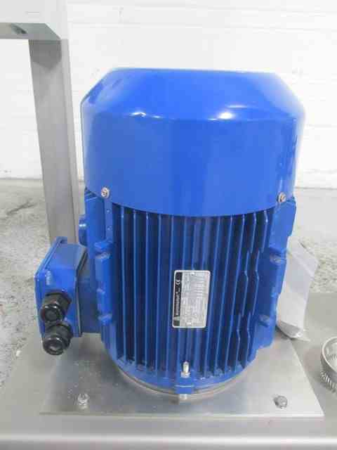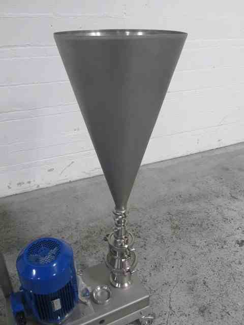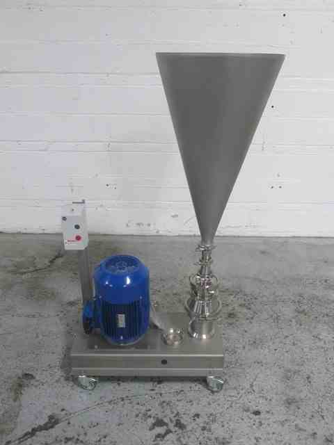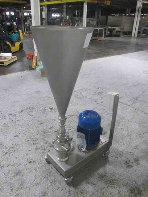 Used Quadro Ytron powder Disperser, Model LD1, stainless steel construction, rated gpm liquid capacity, powder capacity with hopper, 1.5" powder inlet, 1.5" inlet/outlet, on base with 5.5 KW, 480 volt motor, serial# LD1-0006, built 2015.