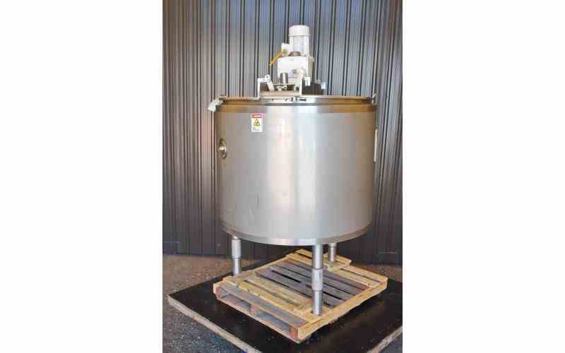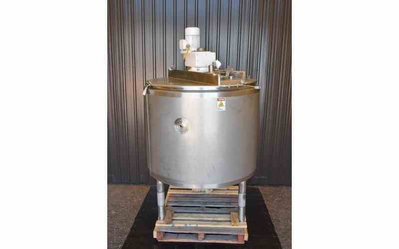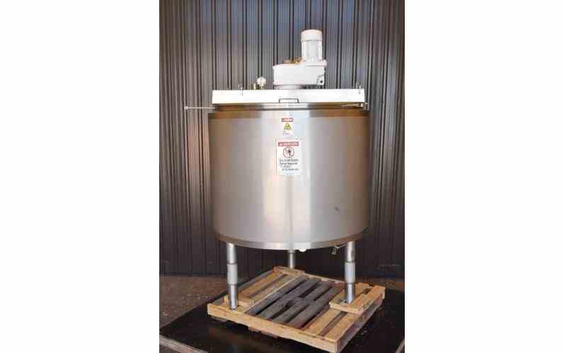USED 200 GALLON JACKETED TANK (KETTLE), STAINLESS STEEL, WITH SCRAPE AGITATION. DIMENSIONS: 48" DIAMETER X 37" DEEP. WITH TWO PART HINGED TOP INLET: TWO 3", TWO 2", TRI CLAMP. DISCHARGE: 3" TRI CLAMP, WITH VALVE. WITH SCRAPE AGITATION WITH TWO SETS OF SCRAPERS (12 & 13). MOTOR: 2 HP, 230/460 VOLT, 1660 RPM. GEAR REDUCER RATIO: 100.78/1, OUTPUT RPM: APPROX. 15. WITH MIXING BAFFLE. OVERALL HEIGHT: 92". PREVIOUS USE: FOOD APPLICATION