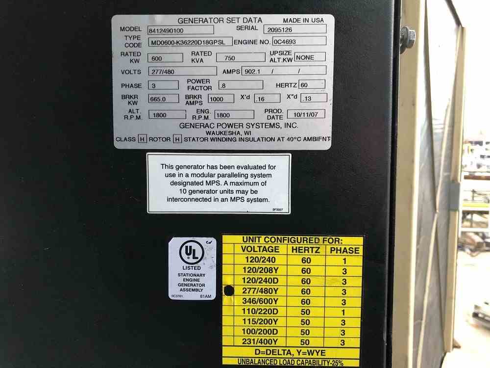 Used 600kW Generac Diesel Generator. Model MD0600. Doosan P222LE engine rated 883 HP at 1800RPM. 277/480V/3/60. 266 hours. Sound attenuated enclosure. 4125 gallon sub-base fuel tank with secondary containment. Passed load test 11/8/2019. Serial #2095126. Built 2007.