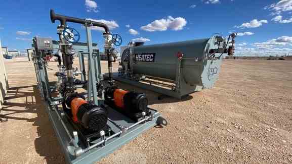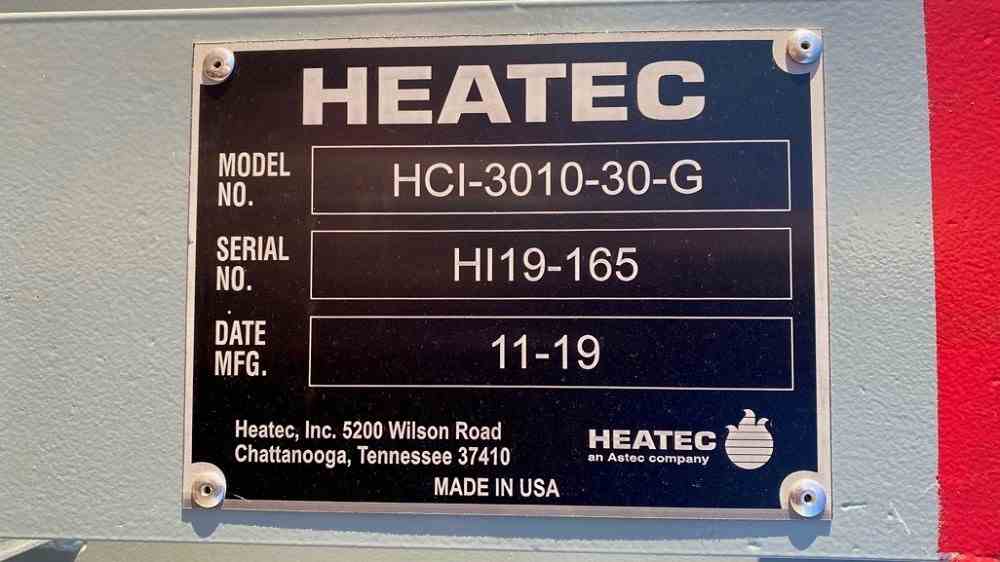 Used Heatec 4MMBTU/Hr Glycol/Water thermal fluid heater. Model HCI-3010-30-G. With Burner, Blower, Controls, Gas train, expansion tank, duplex pump package. Serial #HI19-165. Built 2019.