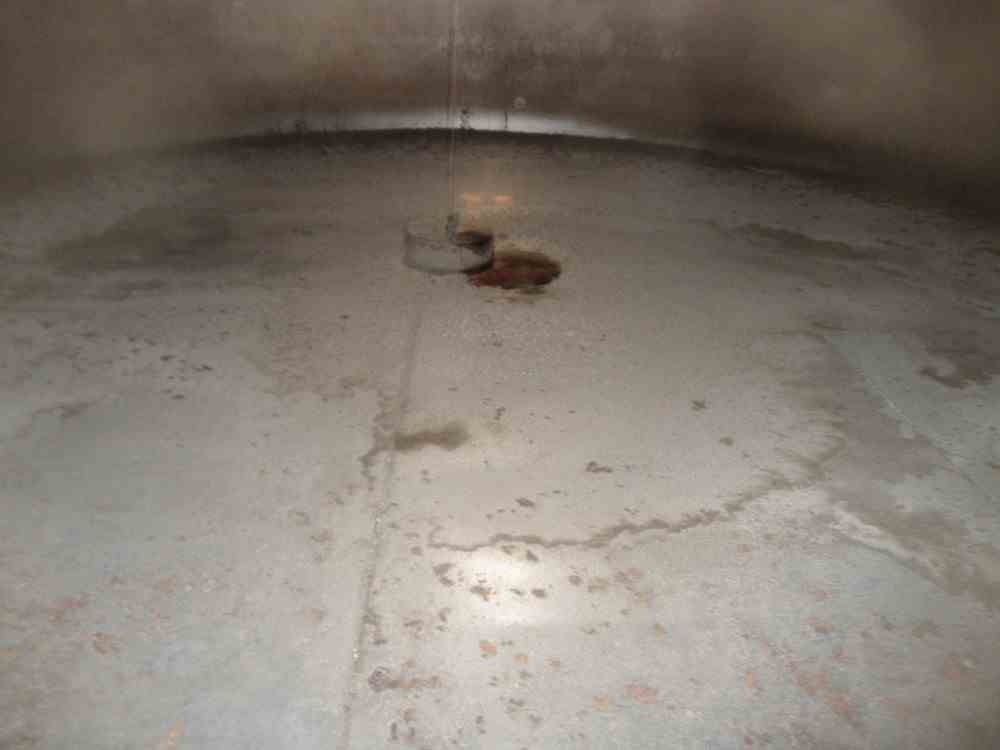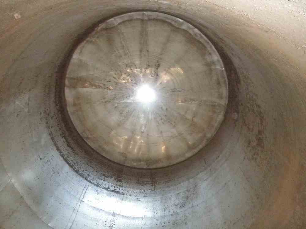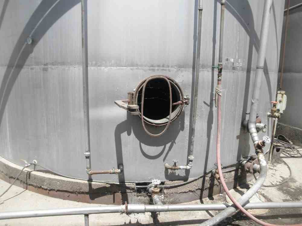 Used 49000 gallon Stainless Steel Tank. 3" diameter side bottom outlet with valve. Pad mounted. 17' diameter X 30' high, with 12" high cone top, 12" sloped bottom. 18" diameter side bottom and top manways. Previously used as fermentation vessel for wines and spirits. Quantity (3) available.