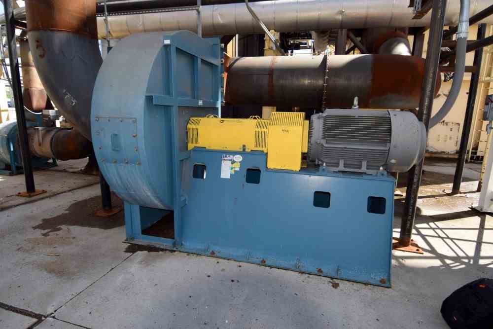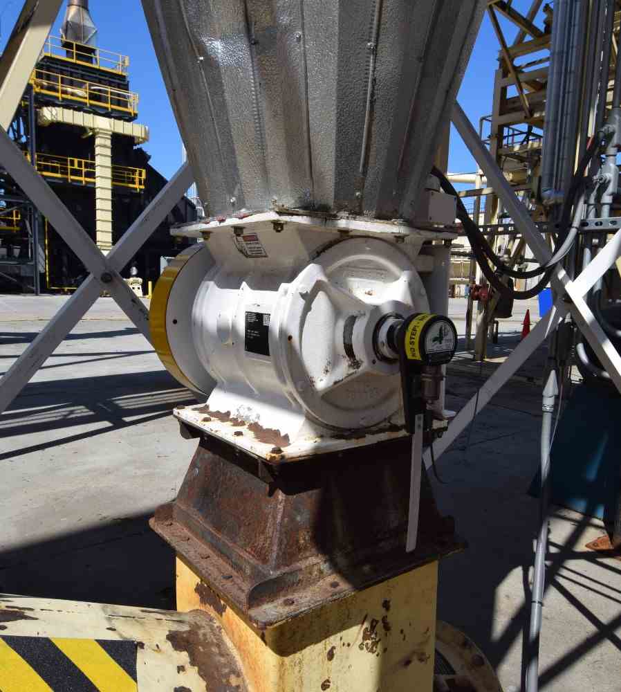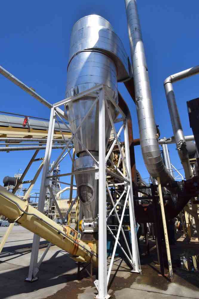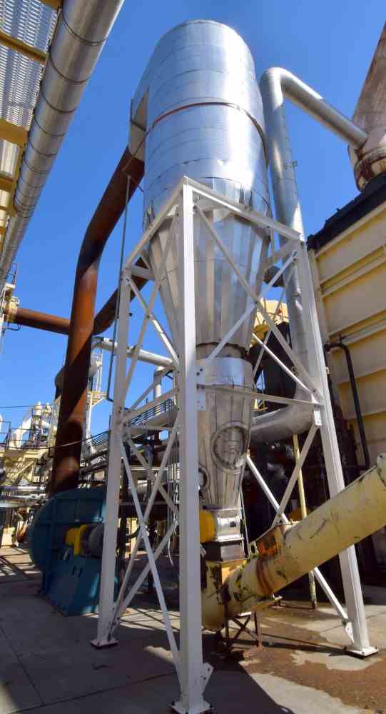 Used Stainless Steel Cyclone, Approximate 7' diameter x 40' tall. Includes a bottom rotary valve and (1) Twin City blower, size 929, type RBR-SW. Driven by a 200hp motor, serial# 19-746510-2-1.