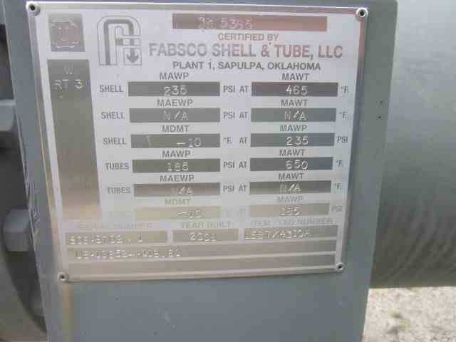 Unused 650 Sq. Ft. Carbon steel shell and tube heat exchangers. Mfg Fabsco. Shell rated 235PSI@485F. Tubes rated 185PSI@650F. National Board #5365. Serial #508-9702-1. Built 2008.