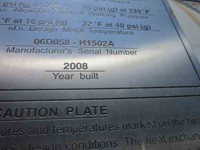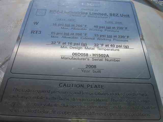 Unused 7782 Sq Ft 316 SS Shell and Tube Heat Exchanger. Mfg Praj Industries. Shell MAWP 16 PSI@266F. (1100) 1.5" OD 4-pass Tubes MAWP 40 PSI@230F. 6'OD x 27'8"OAL. (2) Saddle mounted. National Board #26. Serial #06D058-H1502A. Built 2008.