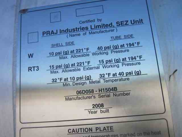 Unused 7782 Sq Ft 316 SS Shell and Tube Heat Exchanger. Mfg Praj Industries. Shell MAWP 10PSI@266F. (1100) 1.5" OD 4-pass Tubes MAWP 40 PSI@230F. 6'OD x 27'8"OAL. (2) Saddle mounted. National Board #24. Serial #06D058-H1504B. Built 2008.