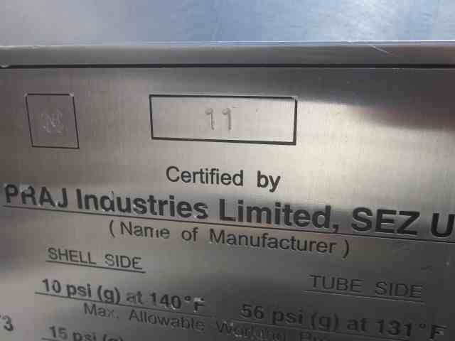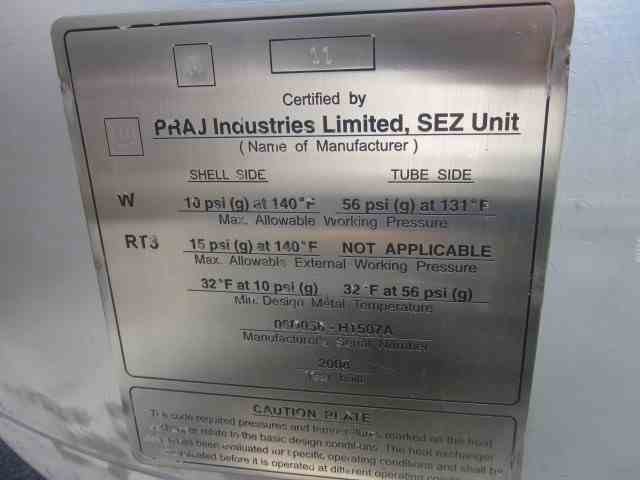 Unused 5672 Sq Ft 304L SS Shell and Tube Heat Exchanger. Mfg Praj Industries. Shell MAWP 10 PSI@140F. (1260) 1"OD Tubes MAWP 56 PSI@131F. (2) Saddle Mounted. Overall 63"D x 20'L. Serial #06D058-H1507A. National Board #11. Built 2008. Used: Surface Condenser - I