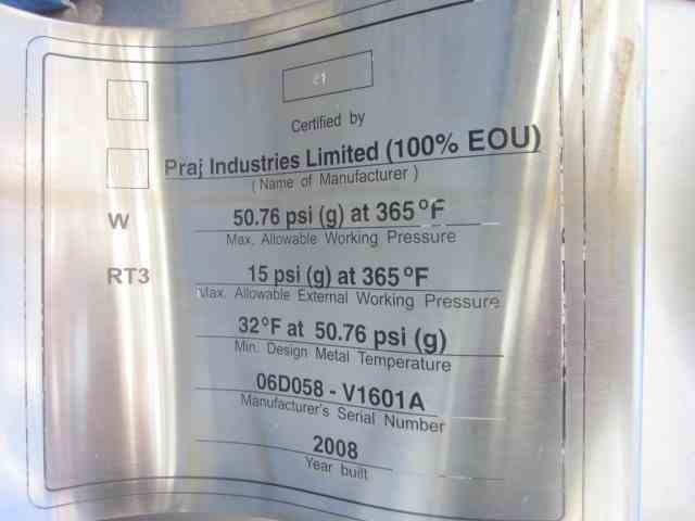 Used 4540 Gallon 304L SS pressure vessel. Mfg Praj Industries. MAWP 50.76 PSI@365F. Dimensions 88"D x 14'. (4) Leg Mounted. National Board #21. Serial #06d058-V1601A. Built 2008. Past use Sieve Bed #1/#2.