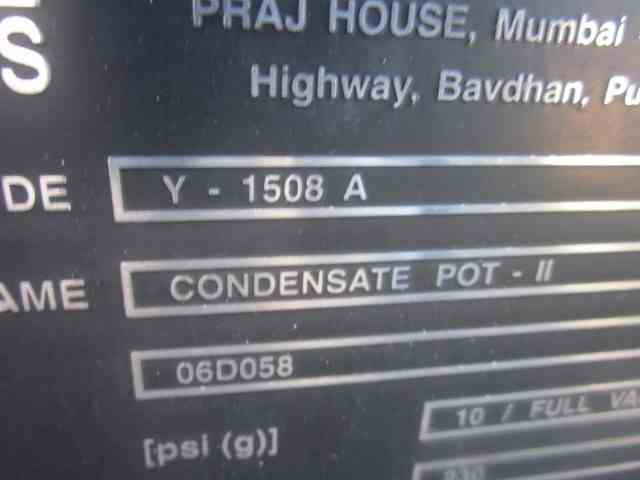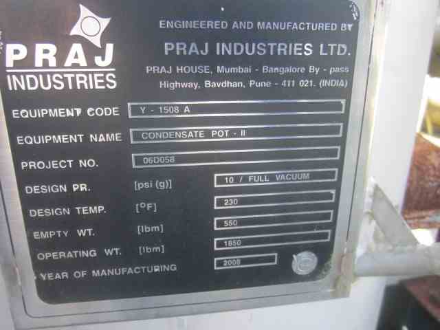 Unused 182 Gallon 304L SS Pressure Vessel. Mfg Praj Industries. MAWP 10 PSI/FV@230F. Lug Mounted. Dished heads. 2'7"D x 4'1"L. Serial #06D58-Y1508A. Built 2008.