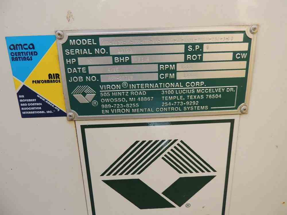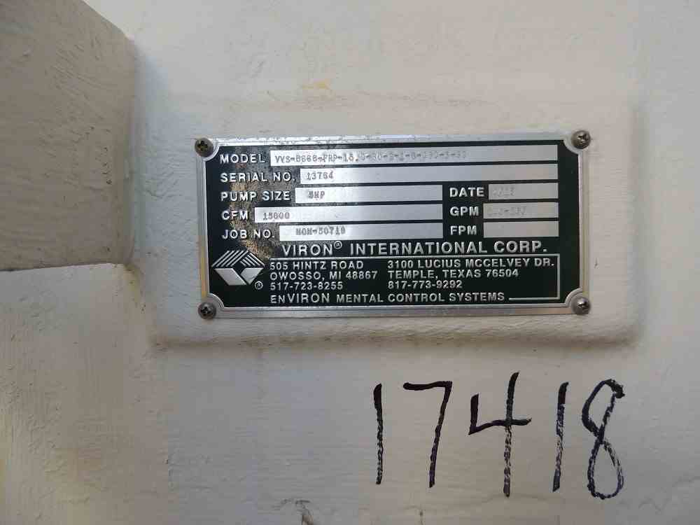 Used 15000 CFM Viron International Scrubber. Model VVS-6666-FRP-15.0-60-S-1-0-460-3-60. 5HP pump. 140-160GPM. Serial #13764. with Blower Model VCB-1130-BD-FRP-FRP-9W-CW360-30-EXPL-PREM-230-3-60. 30HP. Serial #13763. Built 2018.
