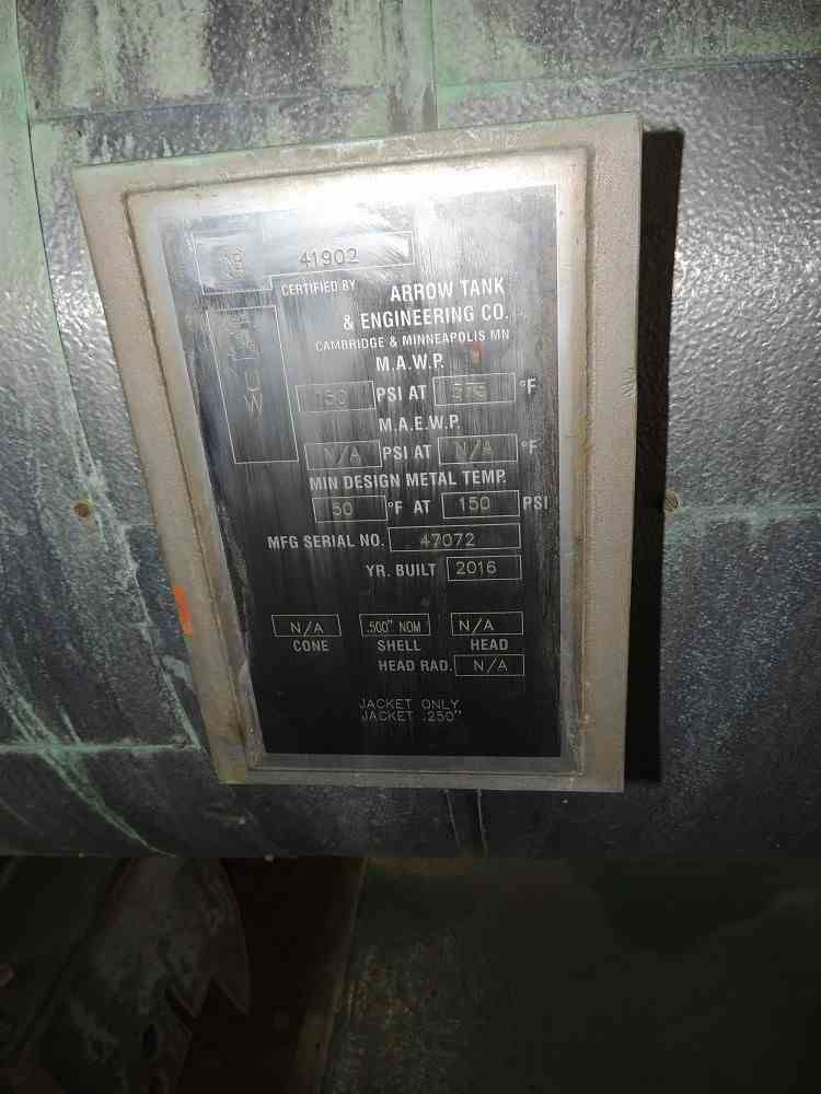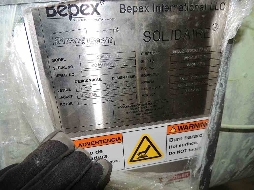 Used Bepex Strong Scott Solidaire 304 Stainless Steel Jacketed Dryer. Model #SJS36-13. 75HP 300RPM belt drive. System Serial#2016050994-8. Built 2016. Tank Mfg Arrow Tank and Engineering Co. Jacket MAWP 150PSI@375F. Serial #47072. National Board #41902. Built 2016.