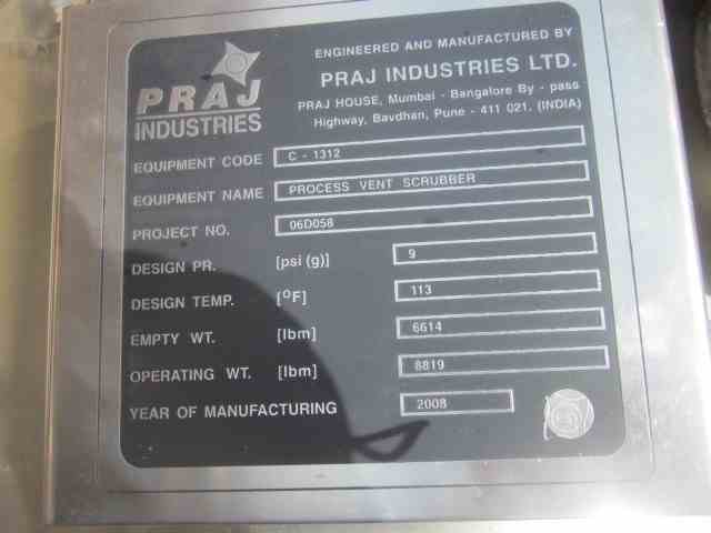 Unused 42"Dia x 30'Tall 304L Stainless Steel Sieve Tray Column. Mfg Praj Ind. (30) 18" Trays at 1' intervals. 9PSI@113F. Support Skirt. Serial #06D058-C1311. Built 2008. Past Use Process Vent Scrubber.
