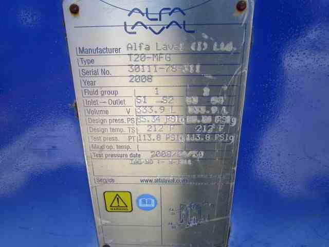 Unused 429 Sq. Ft. Alfa Laval 316 Stainless Steel Plate and Frame Heat Exchanger. Model T20-MFG. (183) 316 SS Plates. Rated 85.34PSI@212F. (4) 8" Nozzles. Carbon Steel Frame. Serial #30111-78-311. Built 2008.