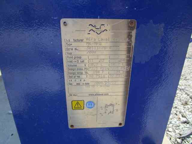 Unused 116 Sq Ft Alfa Laval 316 Stainless Steel Plate and Frame Heat Exchanger. Model M6-MFG. (51) 316 SS Plates Rated 72.5PSI@184F. (4) 2" Nozzles. Carbon Steel Frame. Serial #30111-78-400. Built 2008.