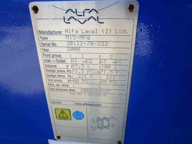 Unused 185 Sq Ft Alfa Laval 316 Stainless Steel Plate and Frame Heat Exchanger. Model M15-MFG. (80) 316 SS Plates Rated 71.5PSI@221F. (4) 6" Nozzles. Carbon Steel Frame. Serial #30111-78-233. Built 2008.