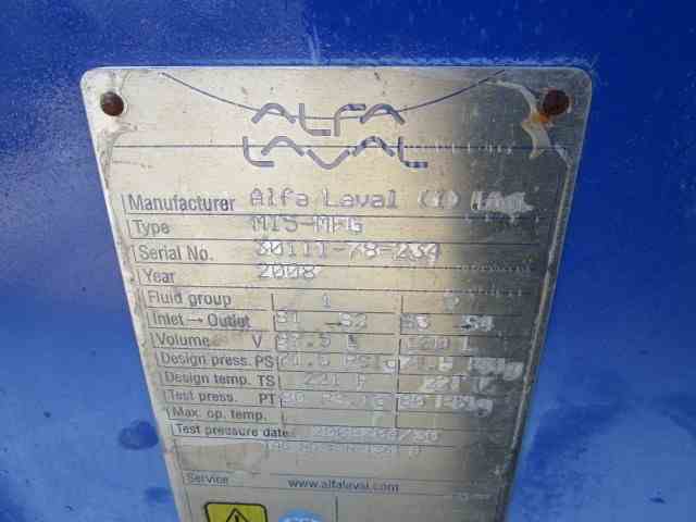 Unused 185 Sq Ft Alfa Laval 316 Stainless Steel Plate and Frame Heat Exchanger. Model M15-MFG. (80) 316 SS Plates Rated 71.5PSI@221F. (4) 6" Nozzles. Carbon Steel Frame. Serial #30111-78-234. Built 2008.