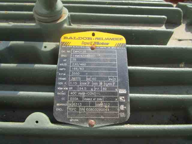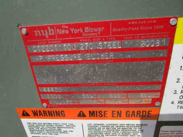 Unused 3300 CFM New York Blower centrifugal blower. Wheel size and type 270 steel. 55.2PSI inlet pressure. 3500 RPM. 75 HP, 230/460 volts, 3550 RPM Baldor motor. Shop # C122101-100. Built 2008.