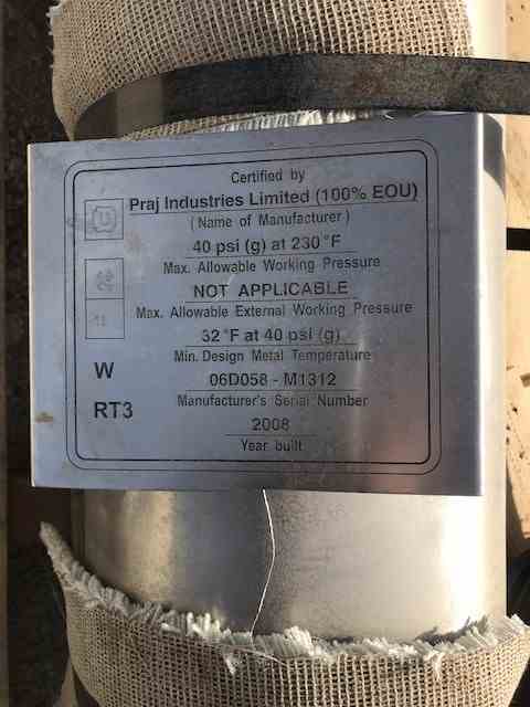 Unused Praj Industries 304 Stainless Steel Static Mixer. Internal rated 40 psi @ 230F. Outer pipe .236" wall thickness, mixing inner pipe is NPS 10 x SCH. 10. 2", 8", 14" inlets. 14" outlet. 10'L x 1'2"D. National Board stamp. Serial #06D058-M1312. Built 2008.