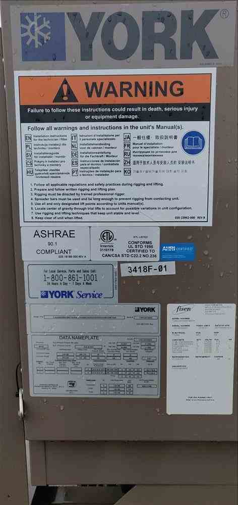 Unused 230 Ton Johnson Controls Air-Cooled Glycol Chiller. Model YLAA0230HE58XCBBXTX. Size: Nominal 230 Tons / 149.5 tons. Optimized compressor for better part-load efficiency. Meets ASHRAE 90.1 as a lower-cost system solution. Seismic certification on selected models and options. Glycol leaving temperature per last application was 24 degrees F.