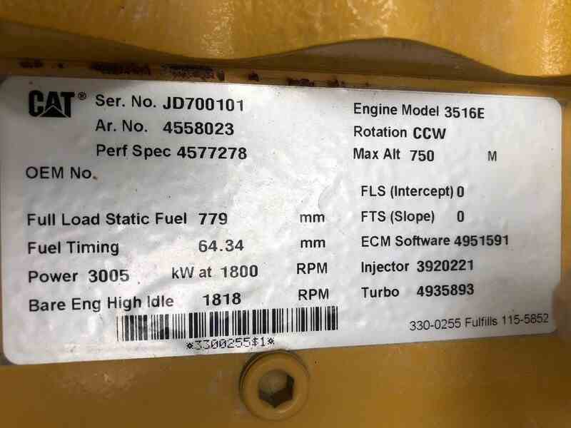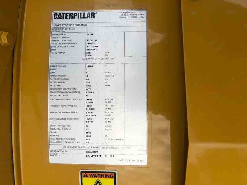New 2750 kW Caterpillar mission critical diesel generator set. Serial #LCK00116. CAT 3516E engine rated 4030 HP at 1800 RPM. Serial #JD700101, EPA Tier 2 emissions. 3/60/12470/13200/13800V. EMCP 4.2 digital control panel. Dual coolant heaters. Engine driven radiator rated 45C / 113F ambient. 0 Hrs. Year 2017. CAT standard 24 month / 1000 Hr warranty upon start up. **New drop over enclosure from CAT C175 sound attenuated 150MPH wind rating available at additional cost** Overall dimensions 104W x 296L x 134H, 46,460 lbs, box loose 30W x 51L x 35H, 981 lbs, box loose 48W x 75L x 30H, 565 lbs.