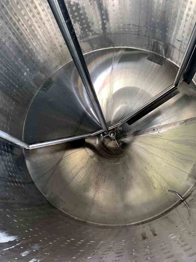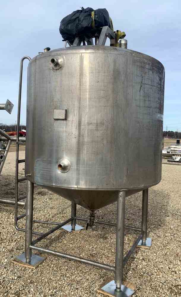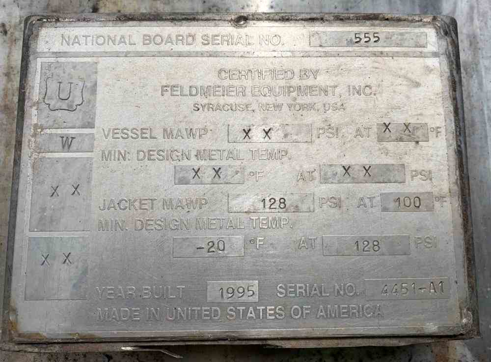 Used 1000 gallon Jacketed Processor Kettle. Mfr Feldmeier. 304 Stainless Steel. Vertical. Approximate 70" diameter x 60" straight side. Dimple jacket rated 128 psi at -20 to 100 degrees F. Sweep Agitation sides and bottom, driven by an approximate 3 hp, 3/60/230/460 volt motor. Openings 20" manway, 4" vent, 3" inlet, 2" CIP inlet. 2" Center bottom outlet. Mounted on (4) legs. National Board # 555. Serial # 4451-A1. Built 1995.