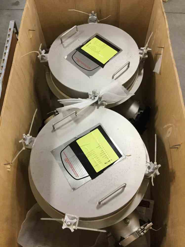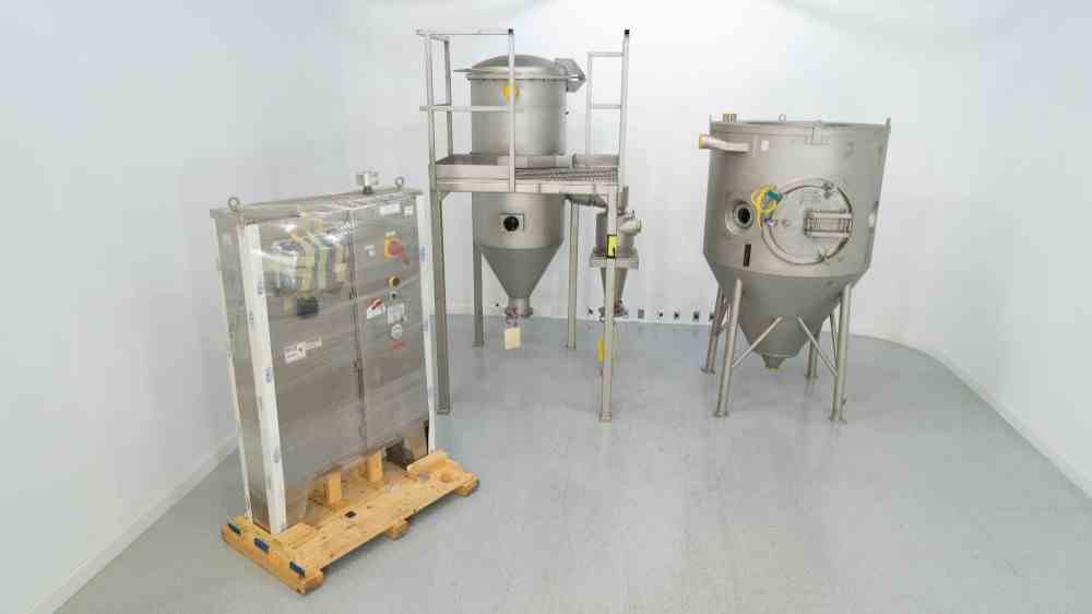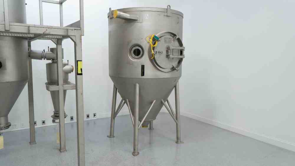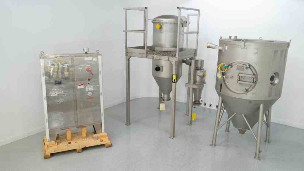 Unused GEA Niro Production Minor Closed Cycle Spray Dryer. Water evaporation capacity 5-30 kg/hr. Nitrogen blanket. Includes Bag housing and cyclone, control panel, atomizer. (2) NYB Blowers, (2) Doyle and Roth Heat Exchangers. Manuals, Spare Parts, and Accessories. Overall Dimensions 4.4m x 2m x 2.7m. Serial #12TA01. Built 2010.