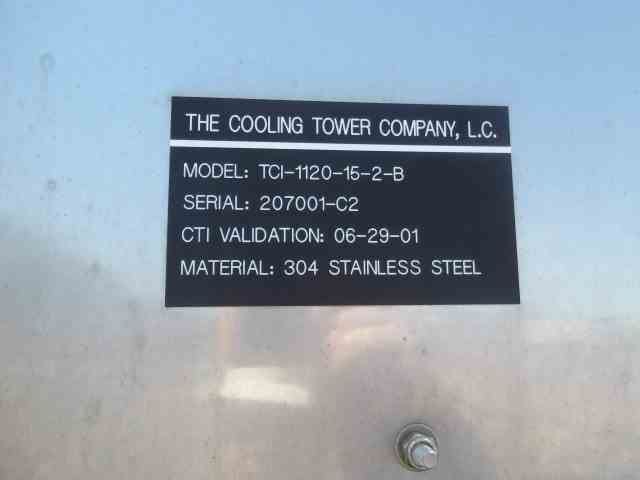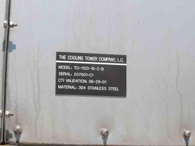 Used 1200 GPM 304 Stainless Steel Cooling Tower. Manufacturer The Cooling Tower Company (TCTC). Model #TCI-1120-15-2-B. 15HP motor with adjustable pitch axial fan. 101F Hot water. 80F entering wet bulb. (2) Cells. Serial #207001-C1 and 207001-C2. CTI validation 2001.