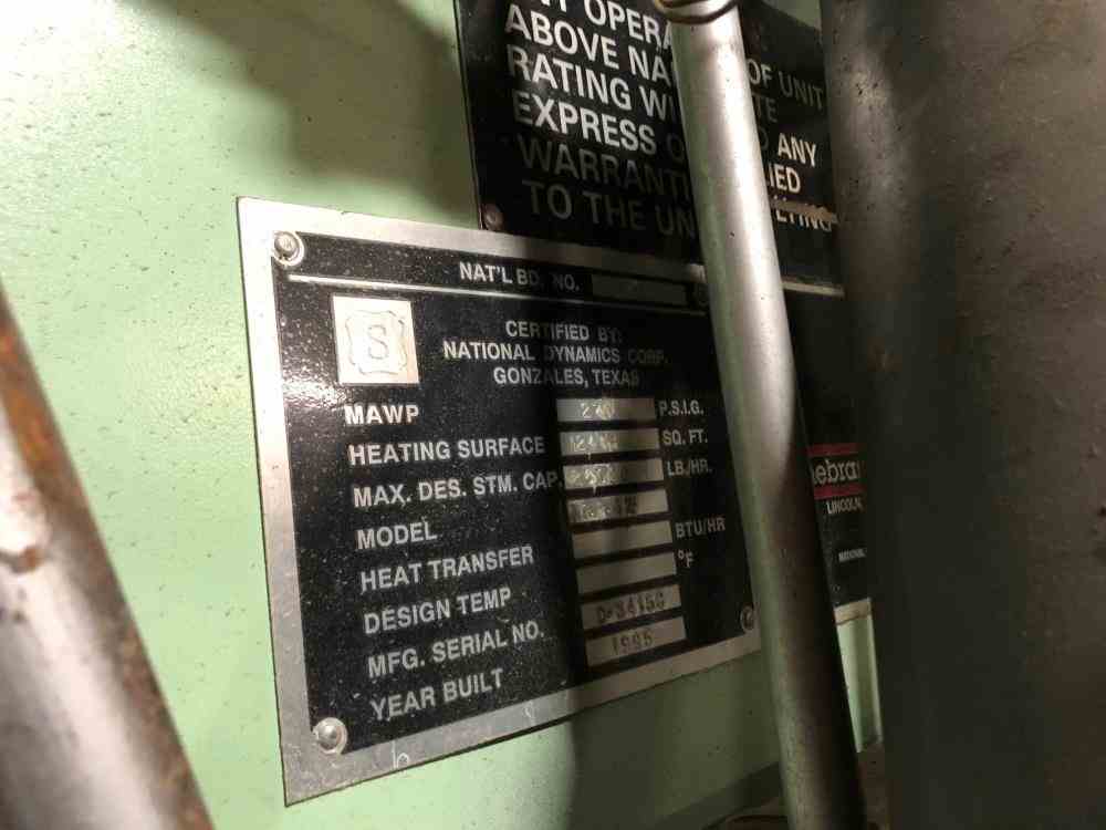 Used 26000 lb/hr Nebraska Water Tube Boiler Packaged Steam Boiler With Economizer. Model NS-B-42. Capacity 26,000 #/Hour Steam Continuous. 220 psi. 2,463 Square Foot Heating Surface. Feed Water Temp 235 Degree F. Serial #D-3415G. Built 1995.