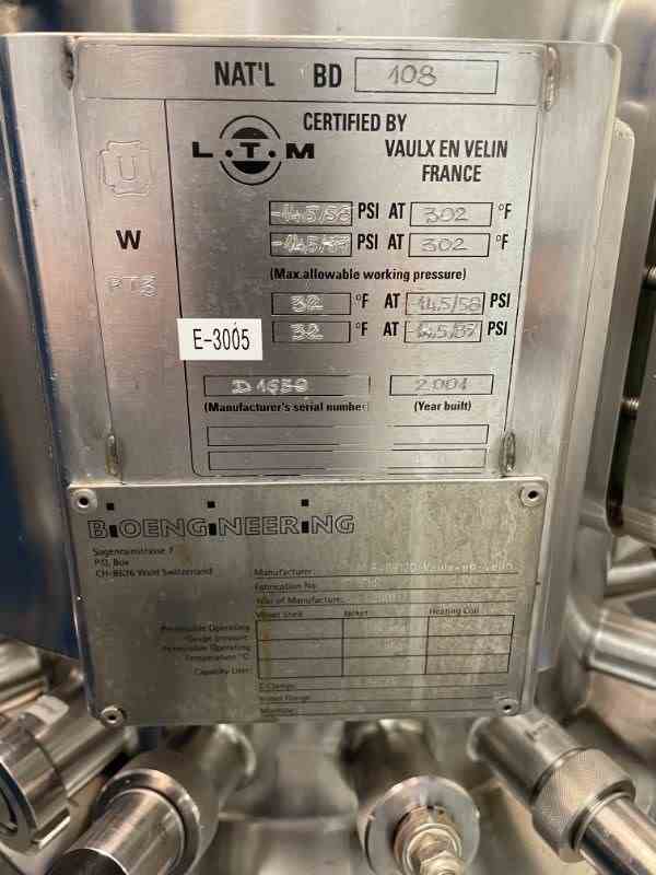 Used 60 Liter Bioreactor with control panel. Manufactured by Bioengineering. 58PSI@302F. Top and side sight glass. (9) side ports. Mounted on Cart with casters. Utilities for water heater, temp control, clean steam sterilization, DO, pH ,ORP probes. National Board #108. Serial #D1659. Built 2001.